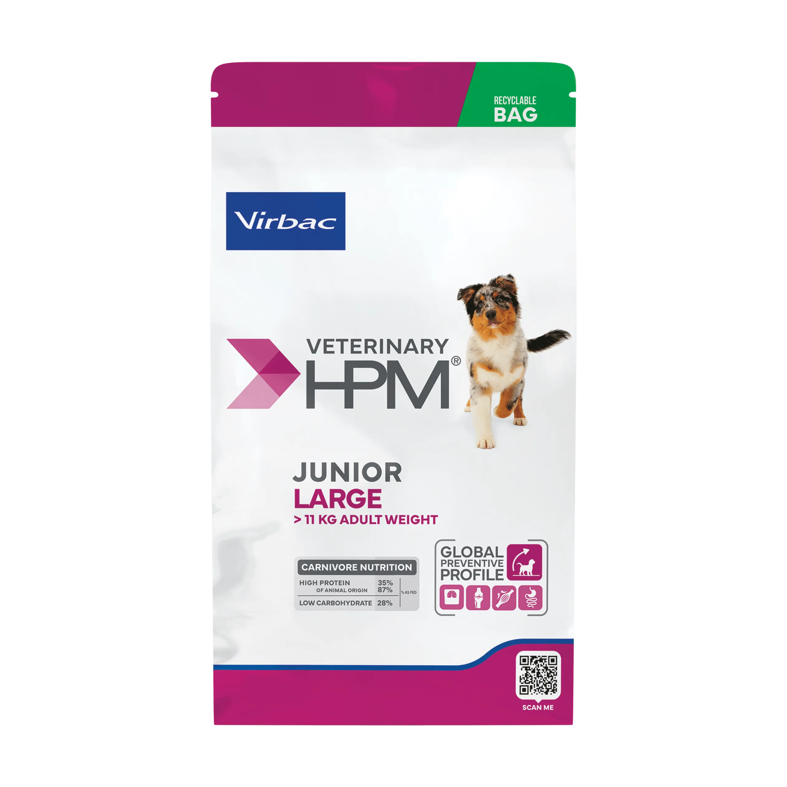 غذای خشک ویربک (Virbac) Veterinary HPM Junior Large محصولی کامل و متعادل برای سگهای جوان نژاد بزرگ است. این فرمول ویژه برای دورهی پس از رشد سریع، یعنی از ۸ تا ۱۸ ماهگی، طراحی شده و با محتوای بالای پروتئین حیوانی، ویتامینها و مواد معدنی، از رشد سالم استخوانها، عضلات و مفاصل حمایت میکند. مناسب برای سگهایی که در بزرگسالی بیش از ۲۵ کیلوگرم وزن دارند.